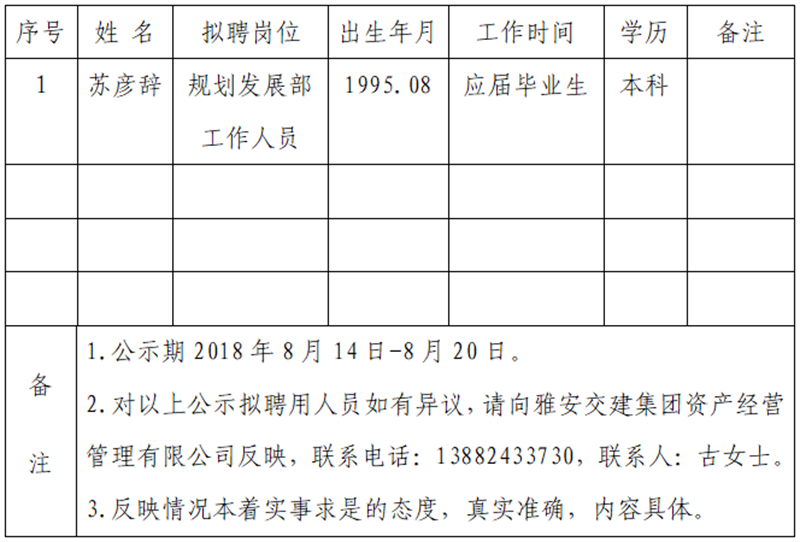 1名拟聘用人员,现公示名单如下: