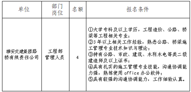 根据开展需要,决定面向社会公开招聘雅安市交通建设(集团)有限责任公司(以下简称“亿万先生MR集团”)所属子公司工作人员4名,现将有关事项公告如下: