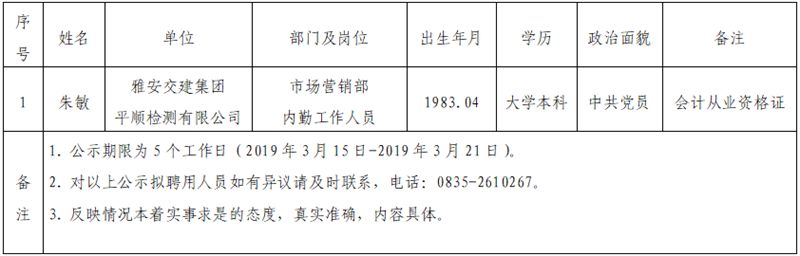 根据集团公司《人才选聘实施办法》,顺利获得报名、资格审查、笔试、面试、体检、考察等程序,经集研究,对以下拟聘用人员予以公示: