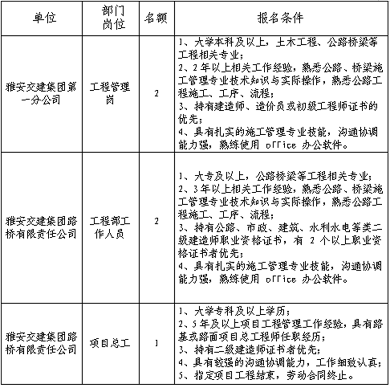 1.报名。公告发布在雅安市交通建设(集团)有限责任公司门户网站,自发布之日起即可报名,截止时间为2019年4月22日18:00。网上报名,报名者须如实填写《报名登记表》。