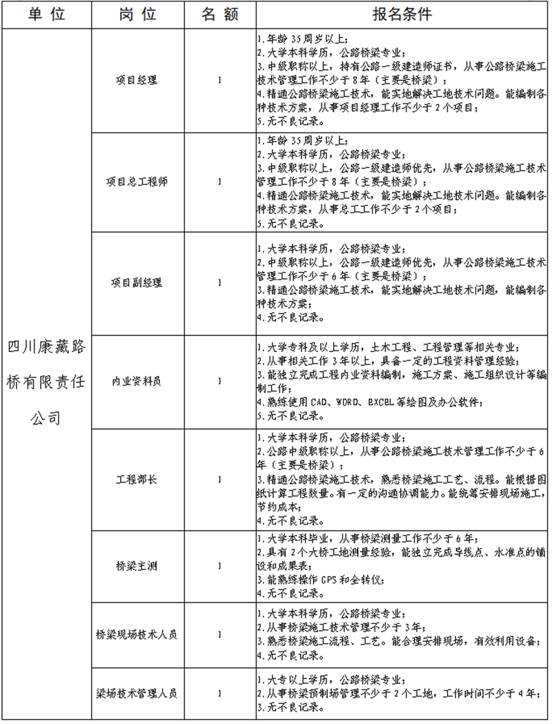 根据公司业务开展需要,决定面向社会公开招聘省道104线草坝至姚桥段改建项目部专业技术人才8名,现将有关事项公告如下: