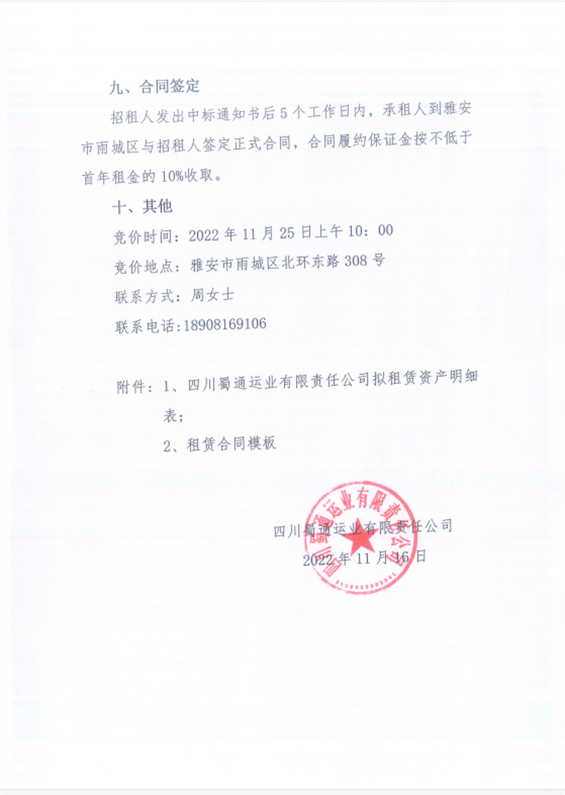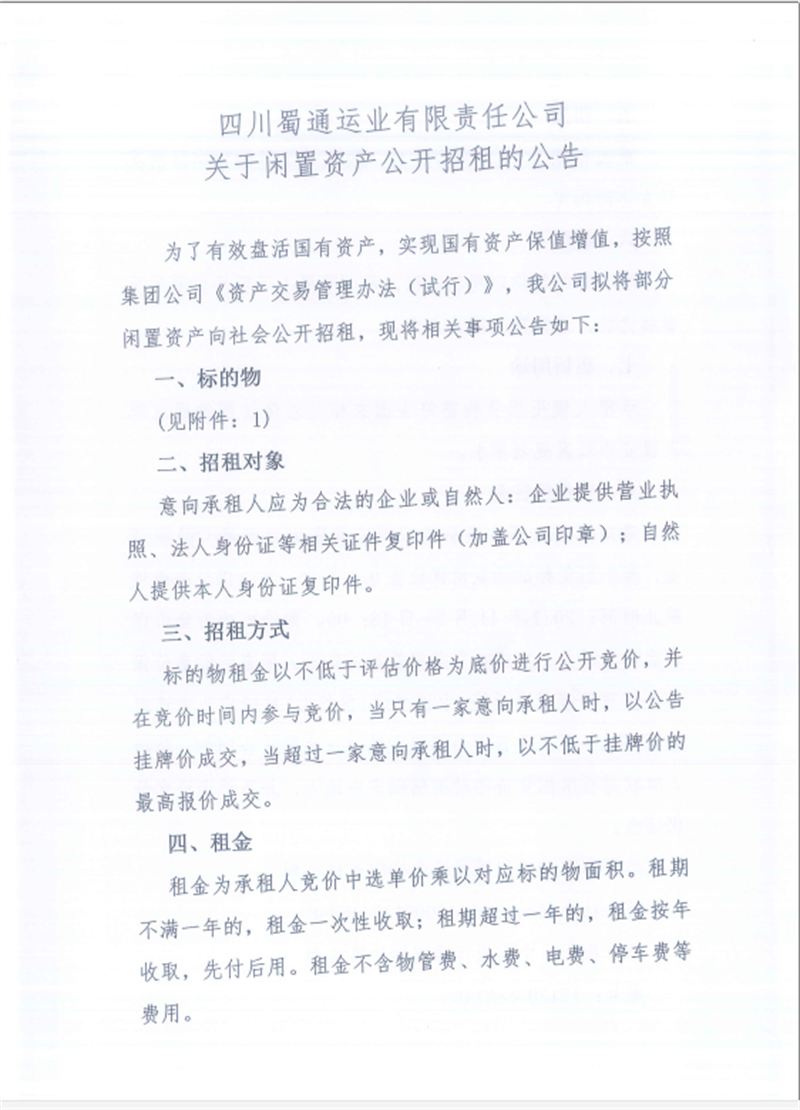 蜀通公司闲置资产招租公告