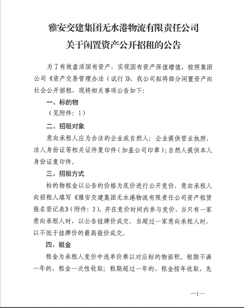 无水港公司关于闲置资产公开招租的公告