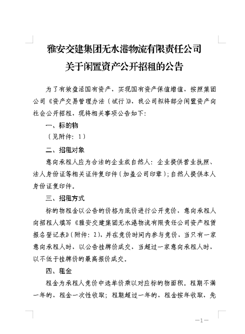 亿万先生MR集团无水港物流有限责任公司关于资产挂网招租的公告