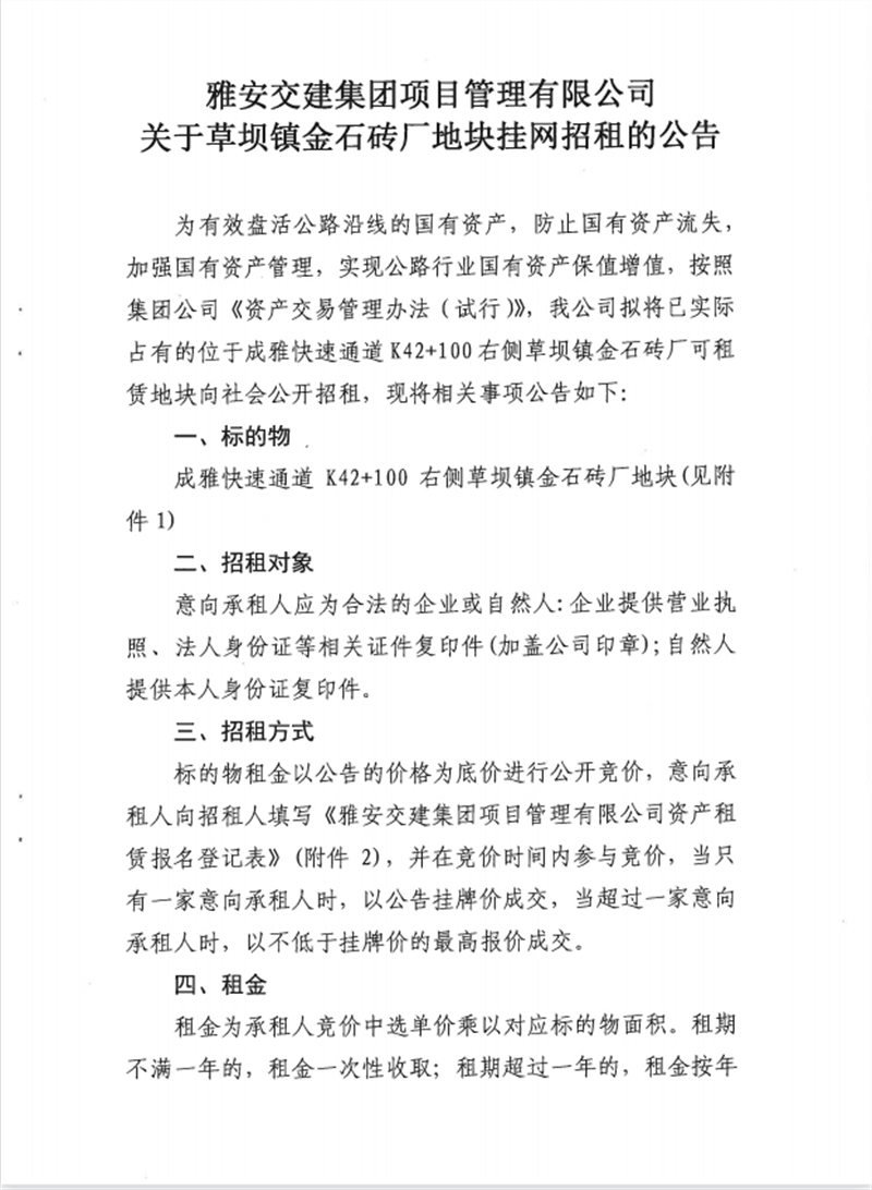 关于金石砖厂地块公开招租的公告
