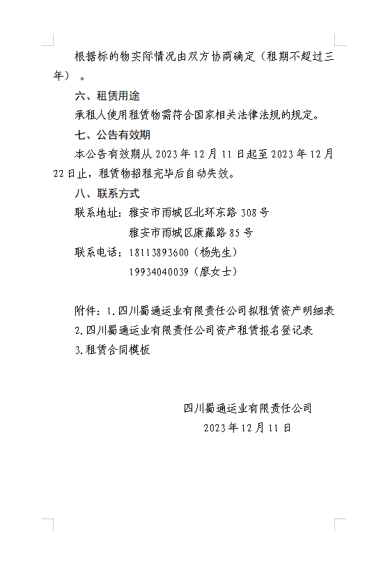 四川蜀通运业有限责任公司关于康藏路85号办公楼4、5、7楼资产租赁公告附件