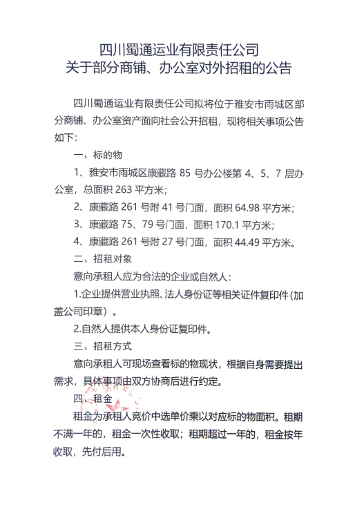 四川蜀通运业有限责任公司关于部分商铺、办公室对外招租的公告