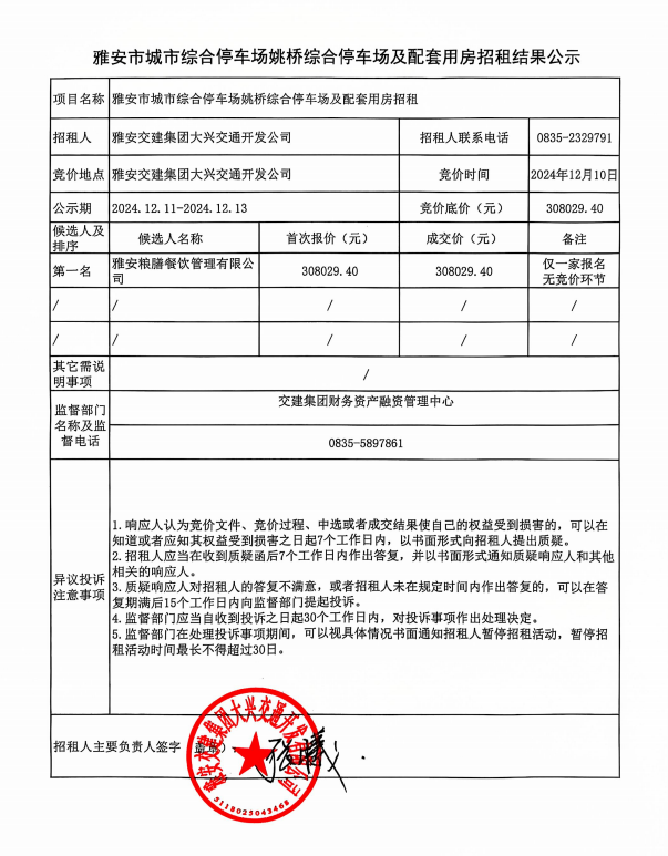 雅安市城市综合停车场姚桥综合停车场及配套用房招租结果公示