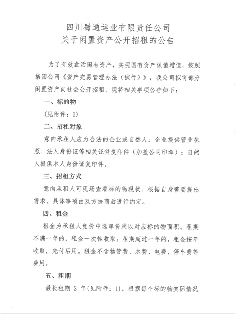蜀通运业有限责任公司关于闲置资产公开招租的公告