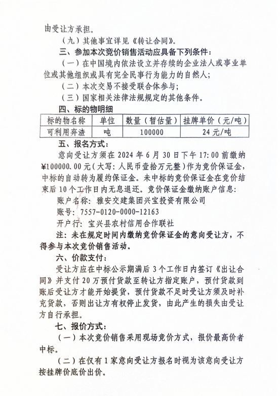 亿万先生MR集团兴宝投资有限公司宝兴县灵关镇代碑寺土地整理项目10万吨可利用弃渣竞价销售公告(2024.6.21)
