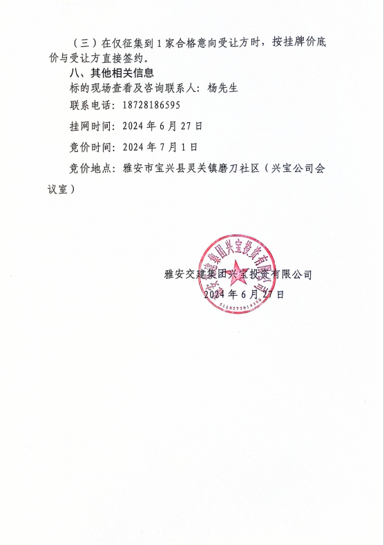 亿万先生MR集团兴宝投资有限公司宝兴县灵关镇代碑寺土地整理项目10万吨可利用弃渣竞价销售公告(2024.6.27)