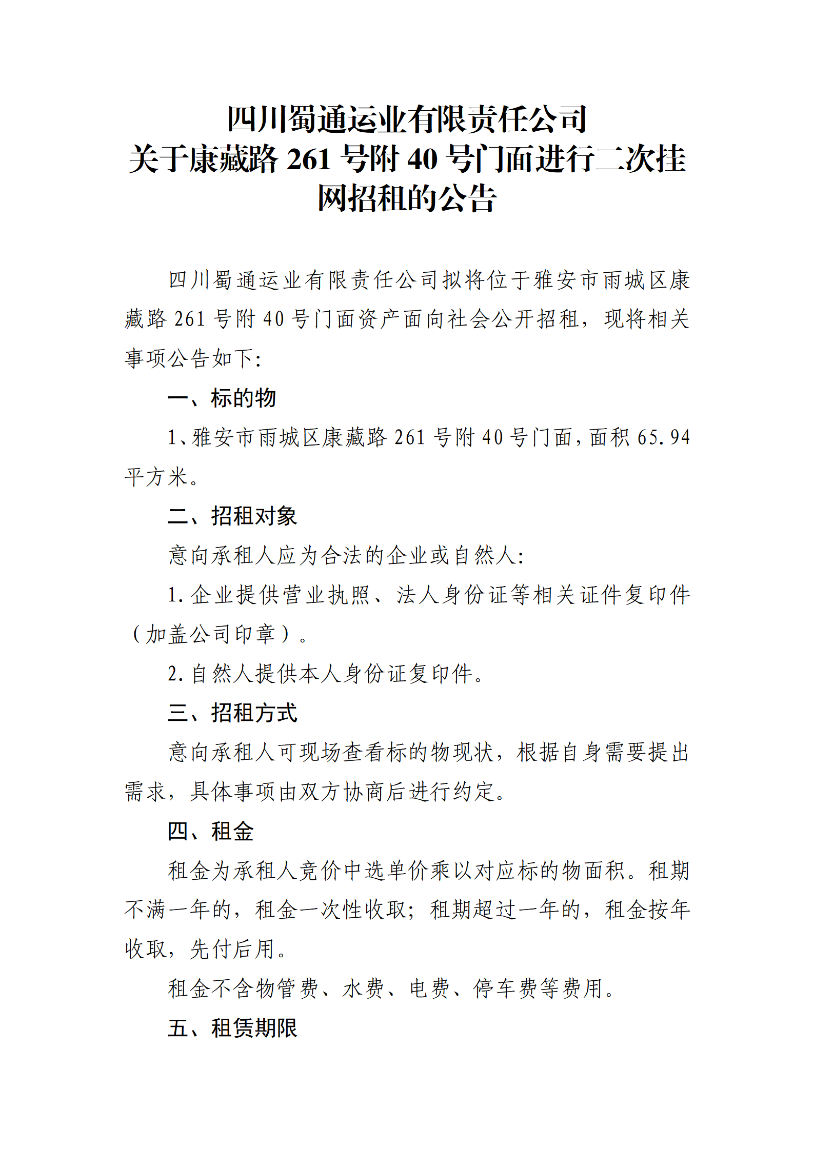 四川蜀通运业有限责任公司 关于康藏路261号附40号门面进行二次挂网招租的公告