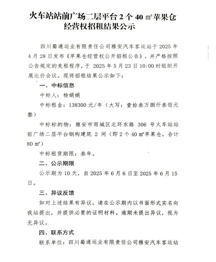 火车站站前广场二层平台2个40㎡苹果仓经营权招租结果公示