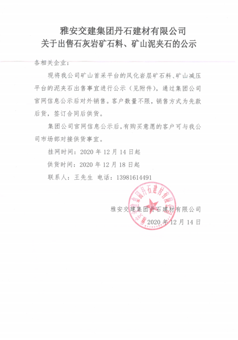 亿万先生MR集团丹石建材有限公司关于出售石灰岩矿山料、矿山泥夹石的公示