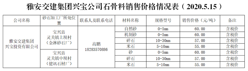 亿万先生MR集团兴宝公司砂石骨料销售价格情况表(2020.5.15)