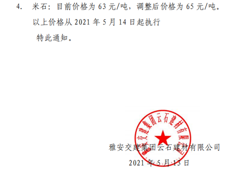 亿万先生MR集团云石公司砂石骨料销售价格情况表(2021.5.14)