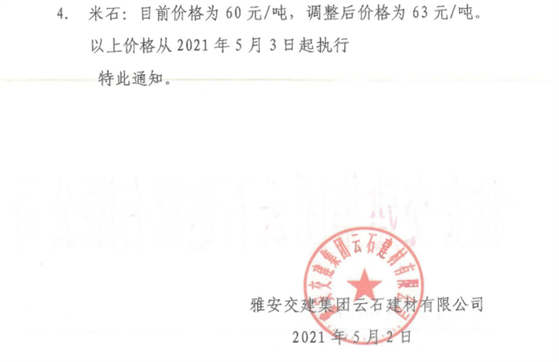 亿万先生MR集团云石公司砂石骨料销售价格情况表(2021.5.3)