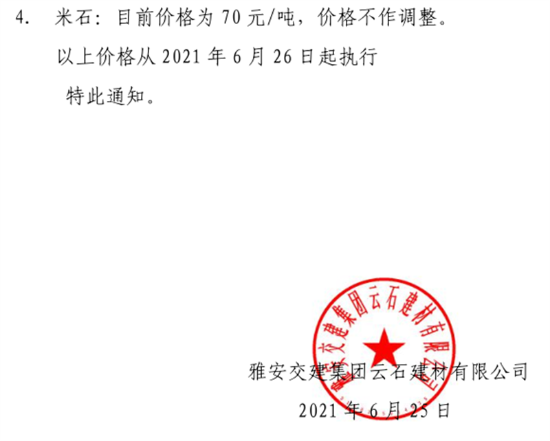 亿万先生MR集团云石公司砂石骨料销售价格情况表(2021.6.24)