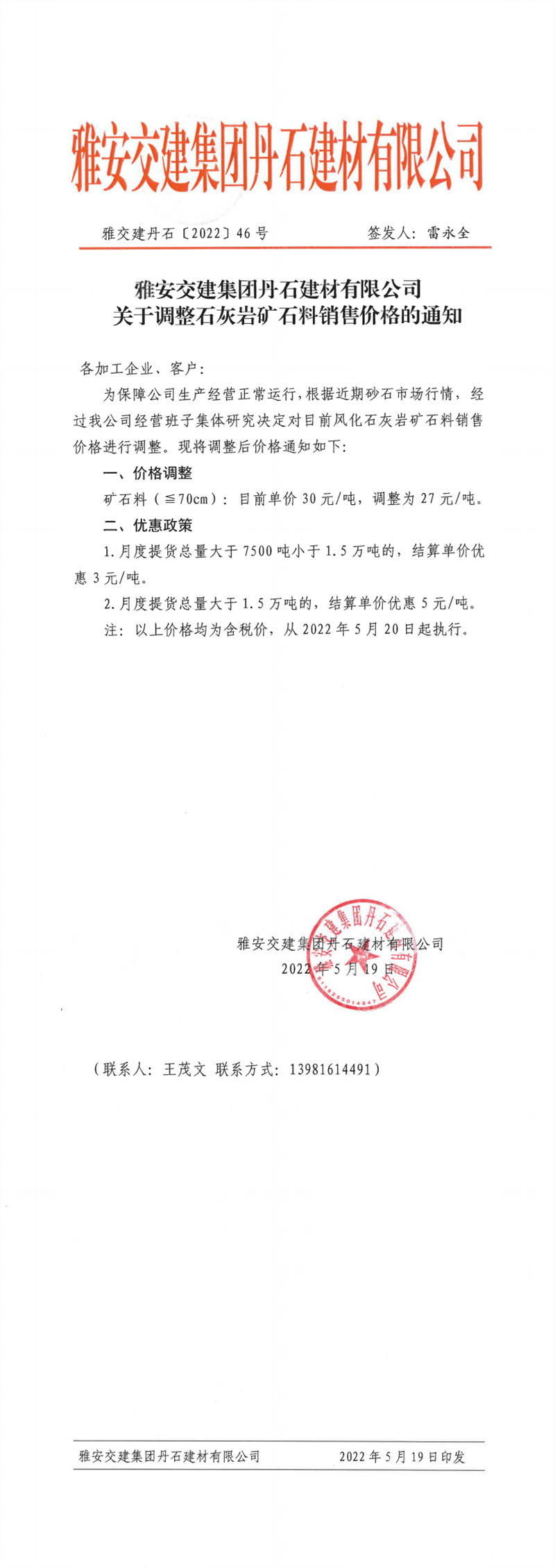 亿万先生MR集团丹石公司关于调整石灰岩矿石料价格的通知-2022-5-19