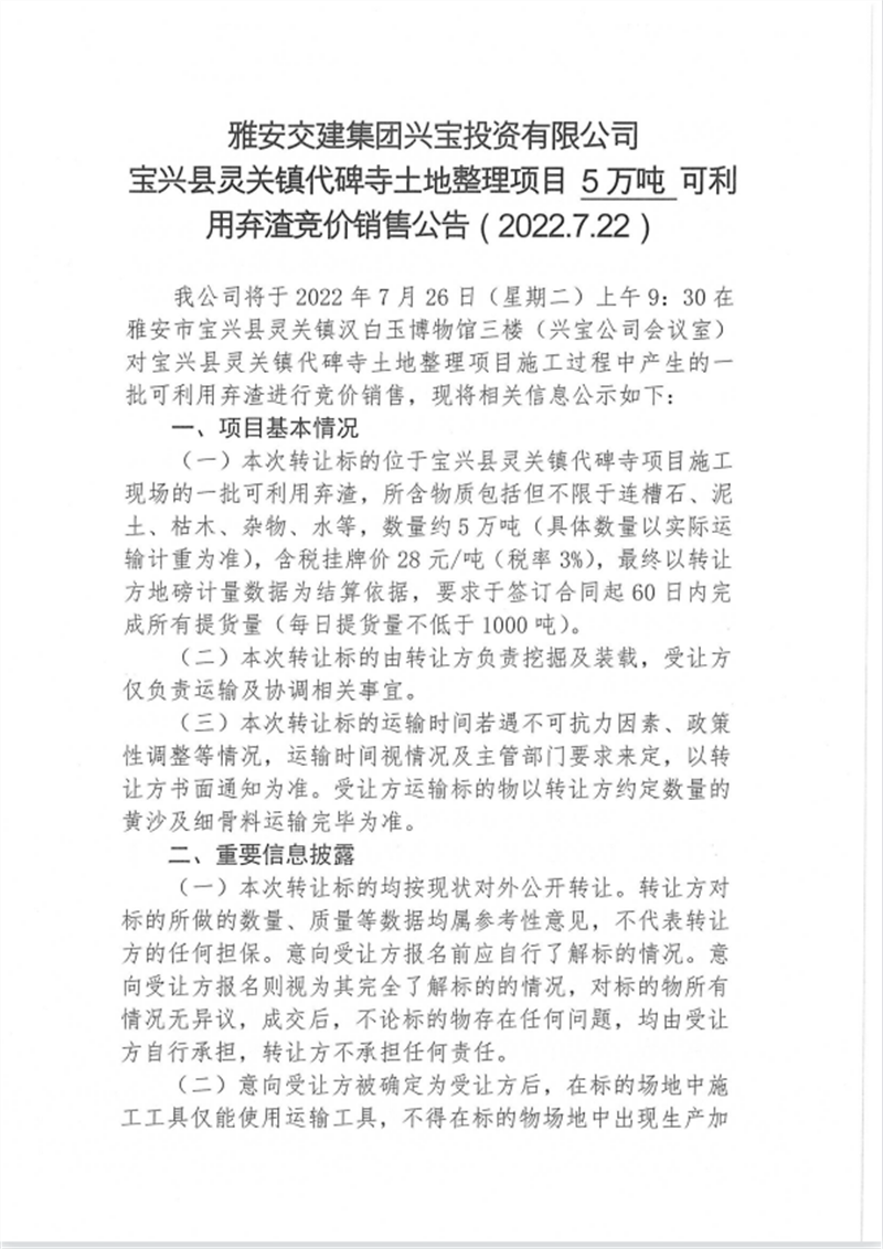 兴宝公司宝兴县灵关镇代碑寺土地整理项目10万吨可利用弃渣竞价销售挂网公告挂网公告7.22(5万吨)