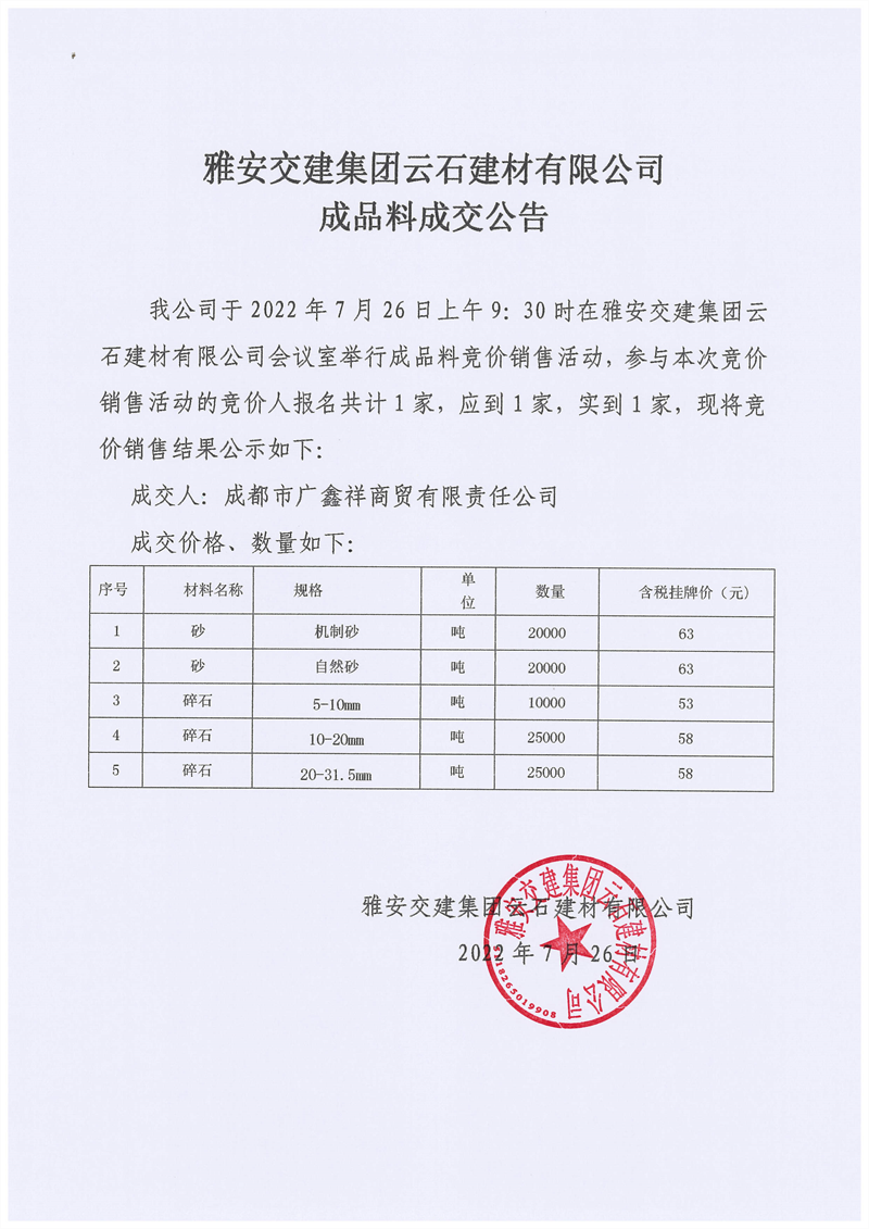 亿万先生MR集团云石建材有限公司成品料竞价销售成交公告7.26