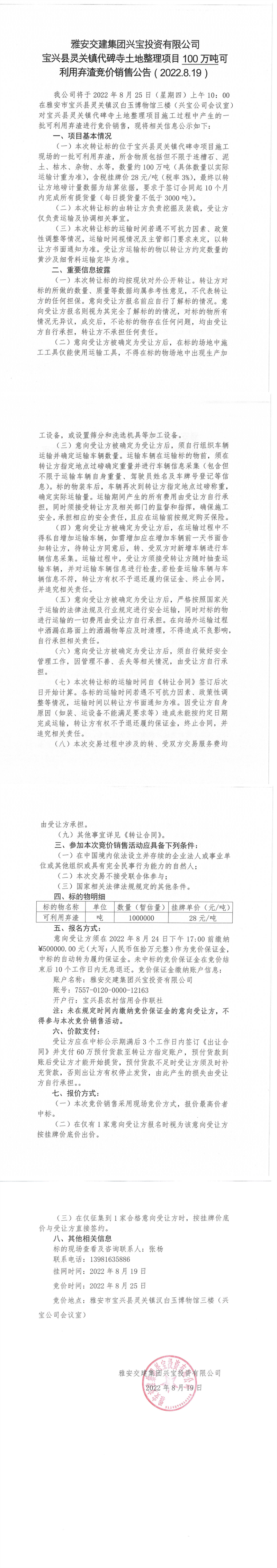 亿万先生MR集团兴宝投资有限公司灵关镇代碑寺土地整理项目10万吨可利用弃渣竞价销售公告(2022.8.19)(1)