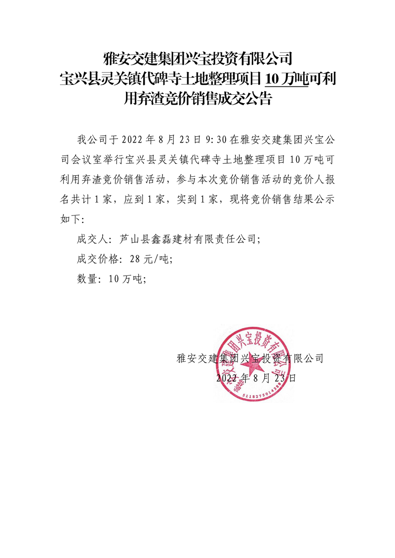 亿万先生MR集团兴宝投资有限公司宝兴县灵关镇代碑寺土地整理项目5万吨可利用弃渣竞价销售成交公告(8.23)
