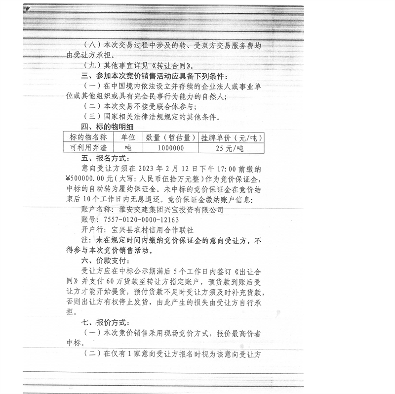 亿万先生MR集团兴宝投资有限公司100万吨可利用弃渣竞价销售流标公告(2023.2.13)