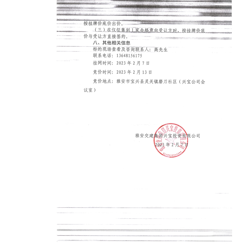 亿万先生MR集团兴宝投资有限公司灵关镇代碑寺土地整理项目100万吨可利用弃渣竞价销售公告(2023.2.7)