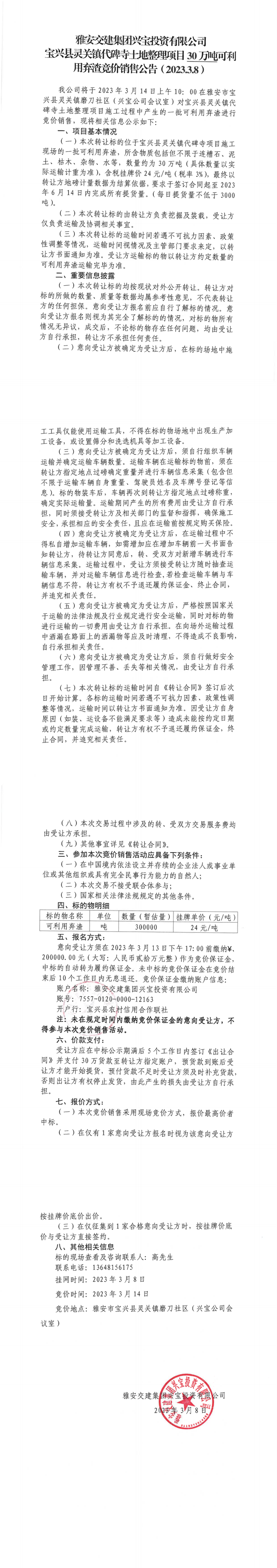 亿万先生MR集团兴宝投资有限公司灵关镇代碑寺土地整理项目30万吨可利用弃渣竞价销售公告(2023.3.8)
