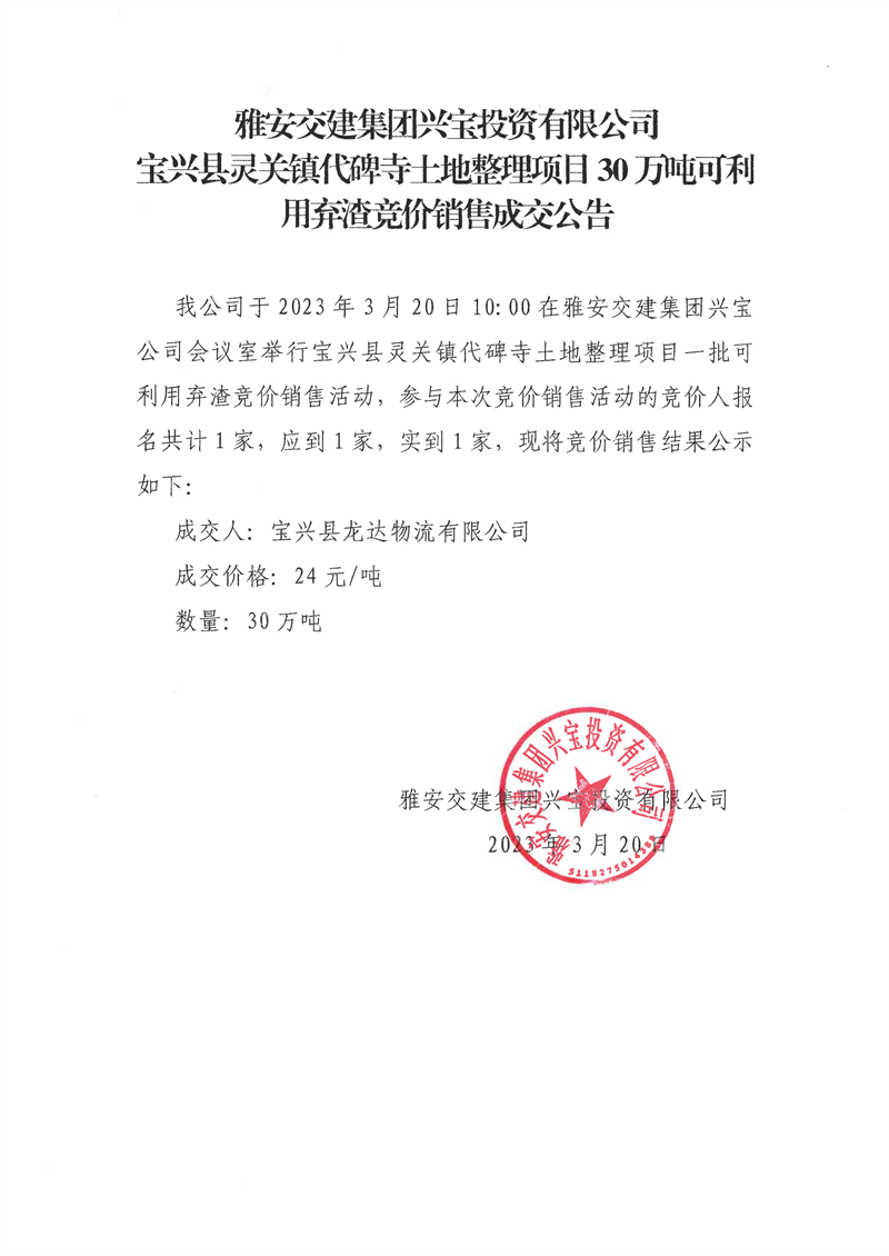 亿万先生MR集团兴宝投资有限公司灵关镇代碑寺土地整理项目30万吨可利用弃渣竞价销售成交公告(2023.3.20)